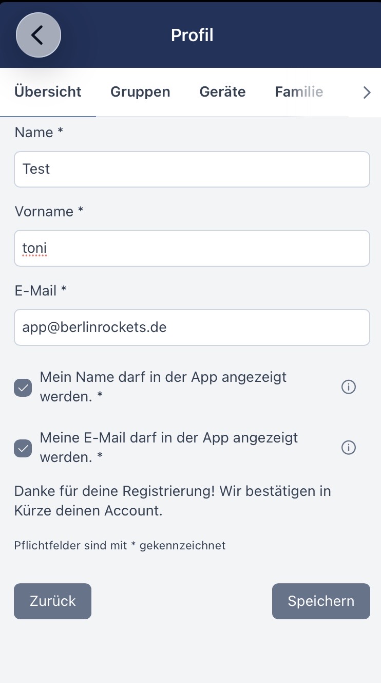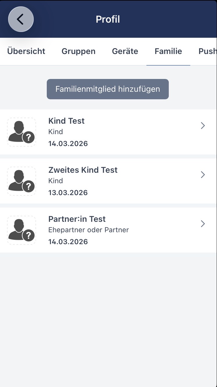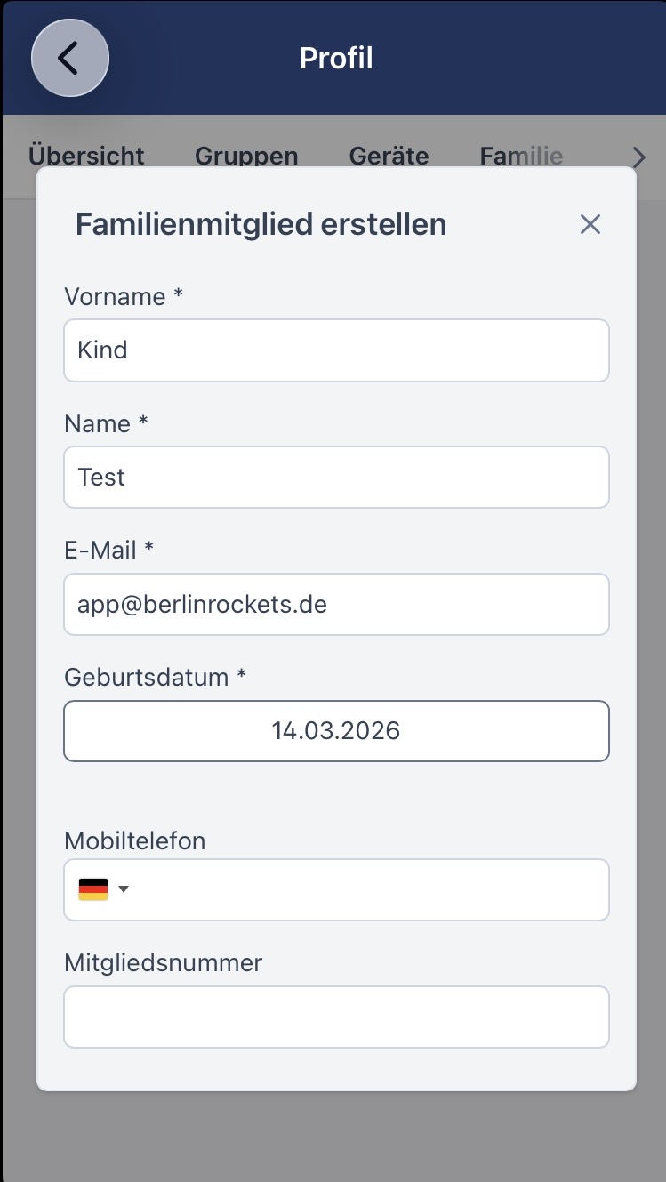 Falls ihr nicht euch selbst, sondern euer Kind oder eure Partner:in oder wer mit in der Familienmitgliedschaft enthalten ist, für Veranstaltungen anmelden möchtet, könnt ihr dieser Person ein eigenes Profil erstellen. Das ist zum Beispiel sinnvoll, wenn du selbst spielst und weitere Familienmitglieder auch. So kannst du sie anmelden beispielsweise, wenn sie kein eigenes Handy haben, oder du ihre Anmeldungen unterstützen möchtest. Hat dein Kind bereits ein eigenes Handy, kannst du die App vom Kinder-Smartphone mit dem Familienmitglied Koppeln. Klicke dazu auf das Kinder-Profil und scanne mit dem Kinder-Smartphone den QR-Code des jeweiligenProfils. Das Familienmitglied ist in den Gruppen, in denen du auch bist. So hast du alle Termine auf einen Blick.