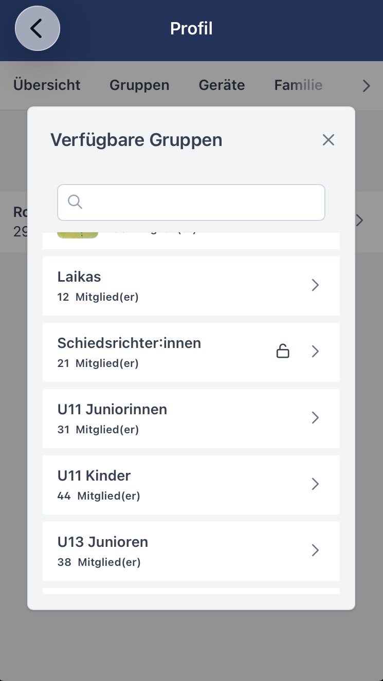 Über das Hauptmenü könnt ihr euer Profil aufrufen und dort im Reiter „Gruppen“ den Trainingsgruppen beitreten, die für euch relevant sind. Dafür müsst ihr zunächst eine Anfrage stellen, die die Verwaltenden der Gruppe annehmen müssen. Wenn ihr als Elternteil der Gruppe eines Kinderteams beitreten wollt, schreibt daher gerne in das Kommentarfeld einen kurzen Hinweis, zu welchem Kind ihr gehört. So können euch die Coaches besser zuordnen, insbesondere, wenn ihr einen anderen Nachnamen habt als euer Kind.