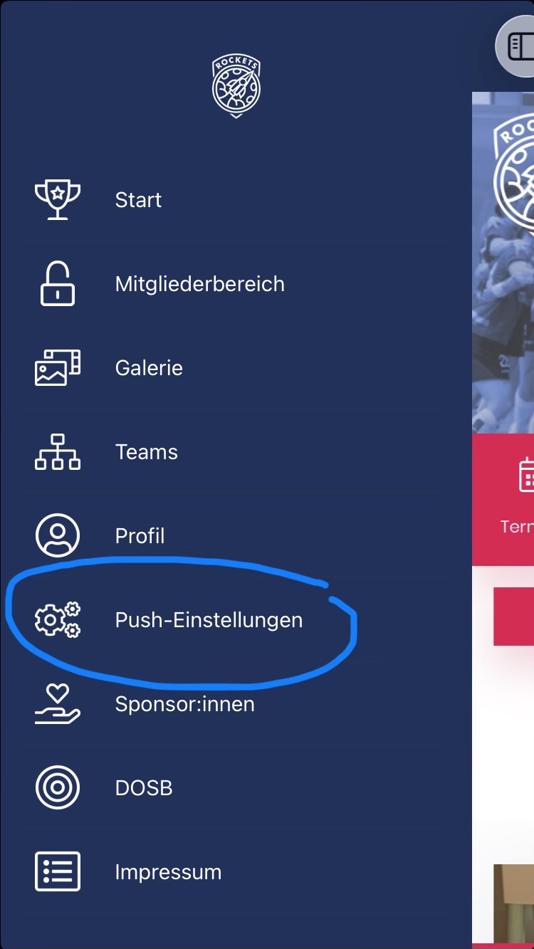 Im Hauptmenü kannst du unter dem Punkt „Push-Einstellungen“ auswählen, zu welchen Bereichen des Vereins du Benachrichtigungen erhalten möchtest. Wenn ein neuer Beitrag zu einer ausgewählten Gruppe erscheint, bekommst du eine Push-Nachricht.