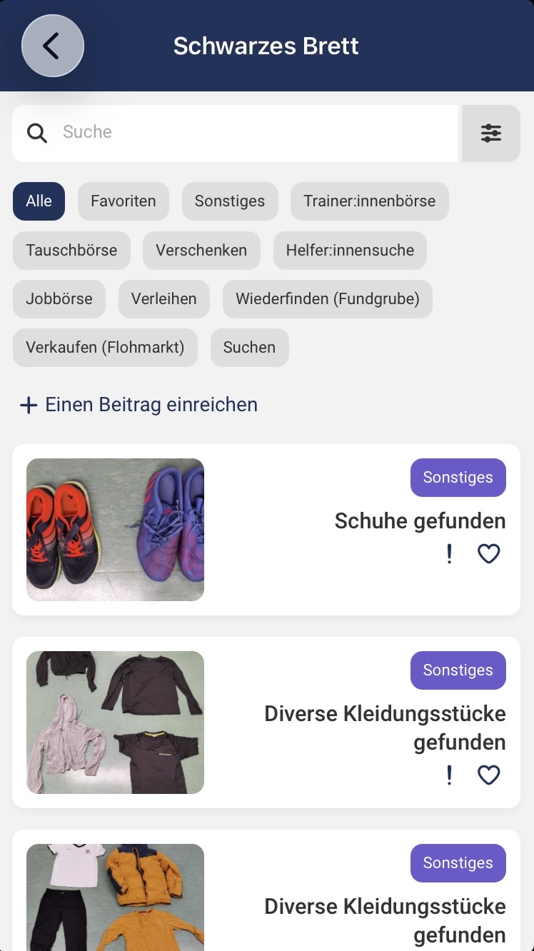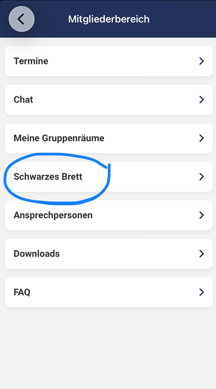 Wenn du auf der Startseite „Mitgliederbereich“ auswählst, kommst du zu einem Menü, in dem du neben Terminen und Chats unter anderem auch das Schwarze Brett und ein FAQ findest. Auf dem Schwarzen Brett findest du beispielsweise Posts zu Fundsachen oder zu verkaufenden gebrauchten Trainingsutensilien. Du kannst hier auch selbst Posts erstellen. Unter „FAQ“ findest du Antworten zu Fragen in den Bereichen App, Liga, Mitgliedschaft und Training.