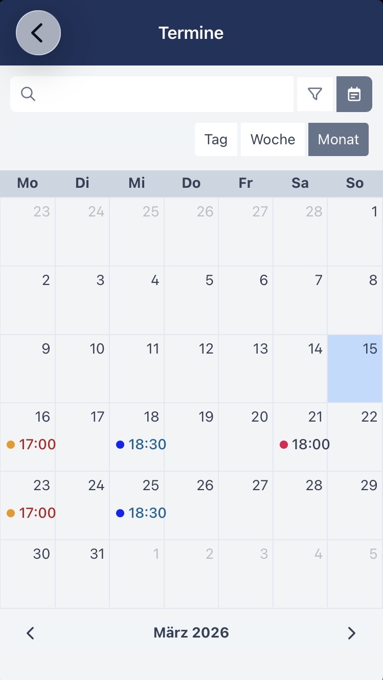 Im Kalender siehst du die Termine der Gruppen, in denen du bist. Gerade bei Spieltagen ist es sinnvoll, sich rechtzeitig im Termin anzumelden. Das erleichtert allen Beteiligten die Planung. Einzelne Termine kannst du als *.ics-Datei auch in die Kalender-App deines Mobilgeräts importieren. Wenn man in vielen Gruppen ist, kann es hilfreich sein, einige Kalender auszublenden oder die Monatsansicht auszuprobieren.